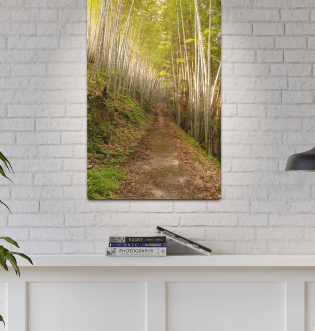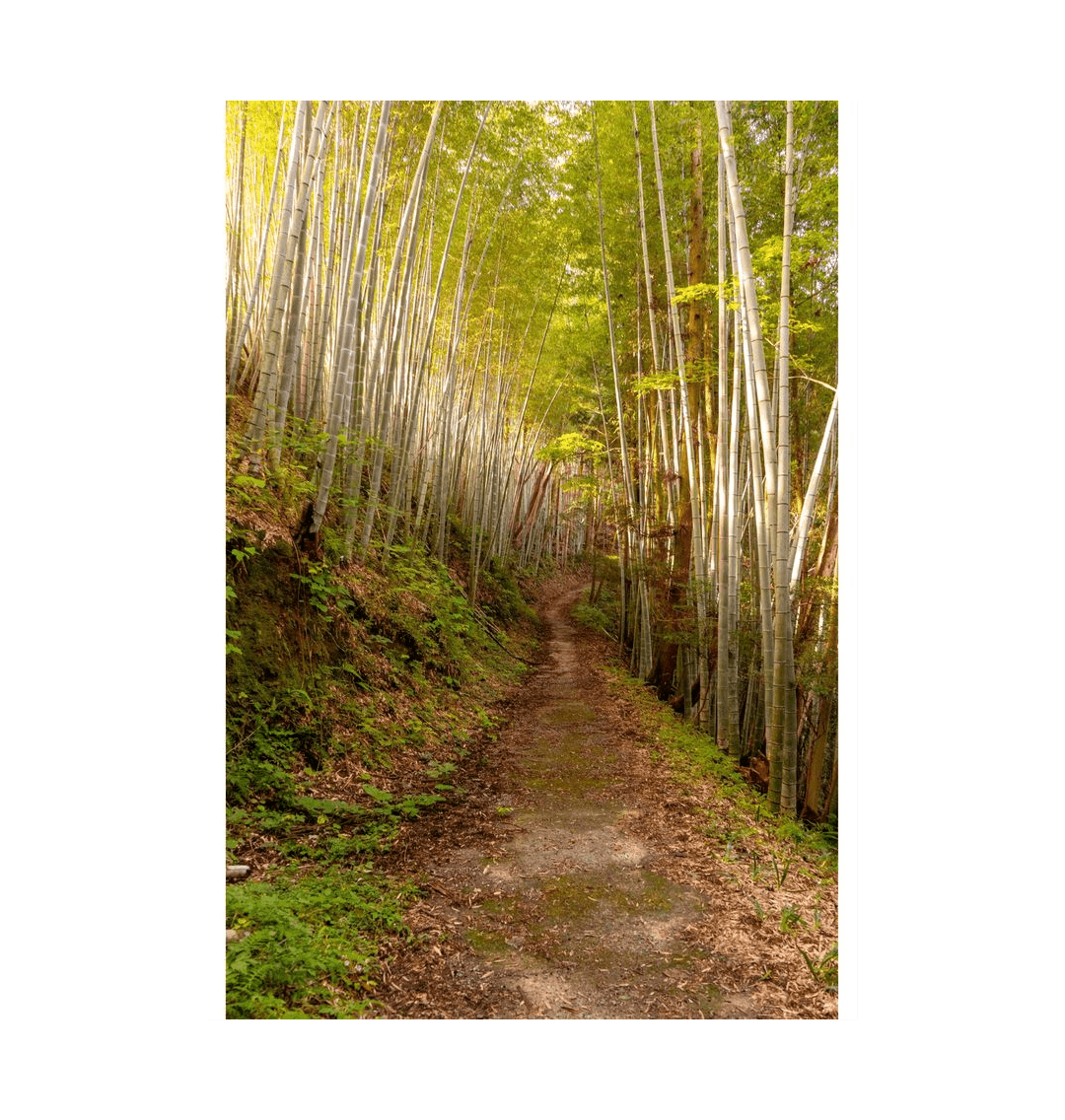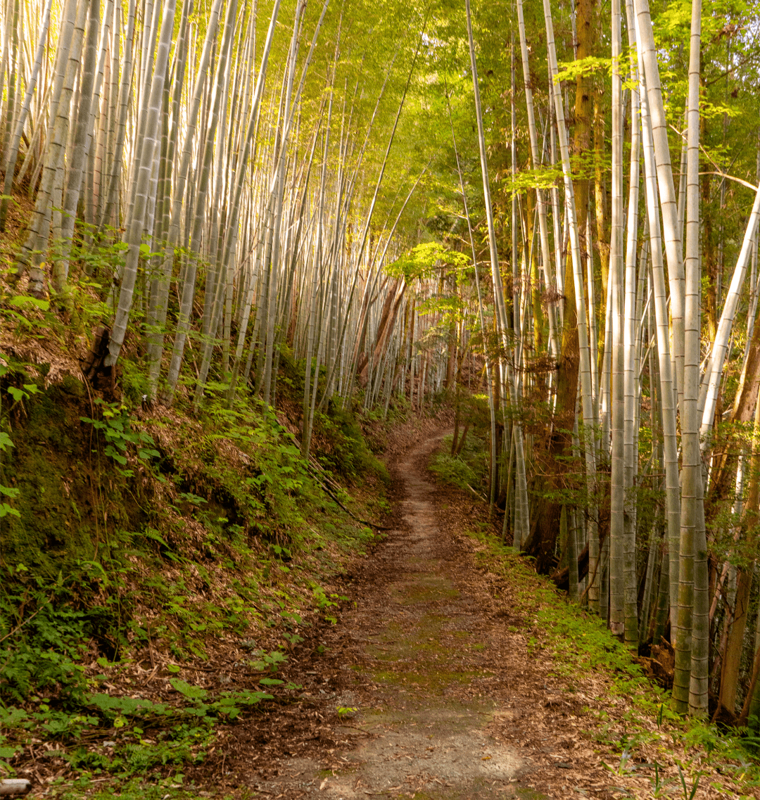 A pathway through a bamboo forest is illuminated in gold along the Koyasan Choishimichi pilgrimage outside of Osaka, Japan.